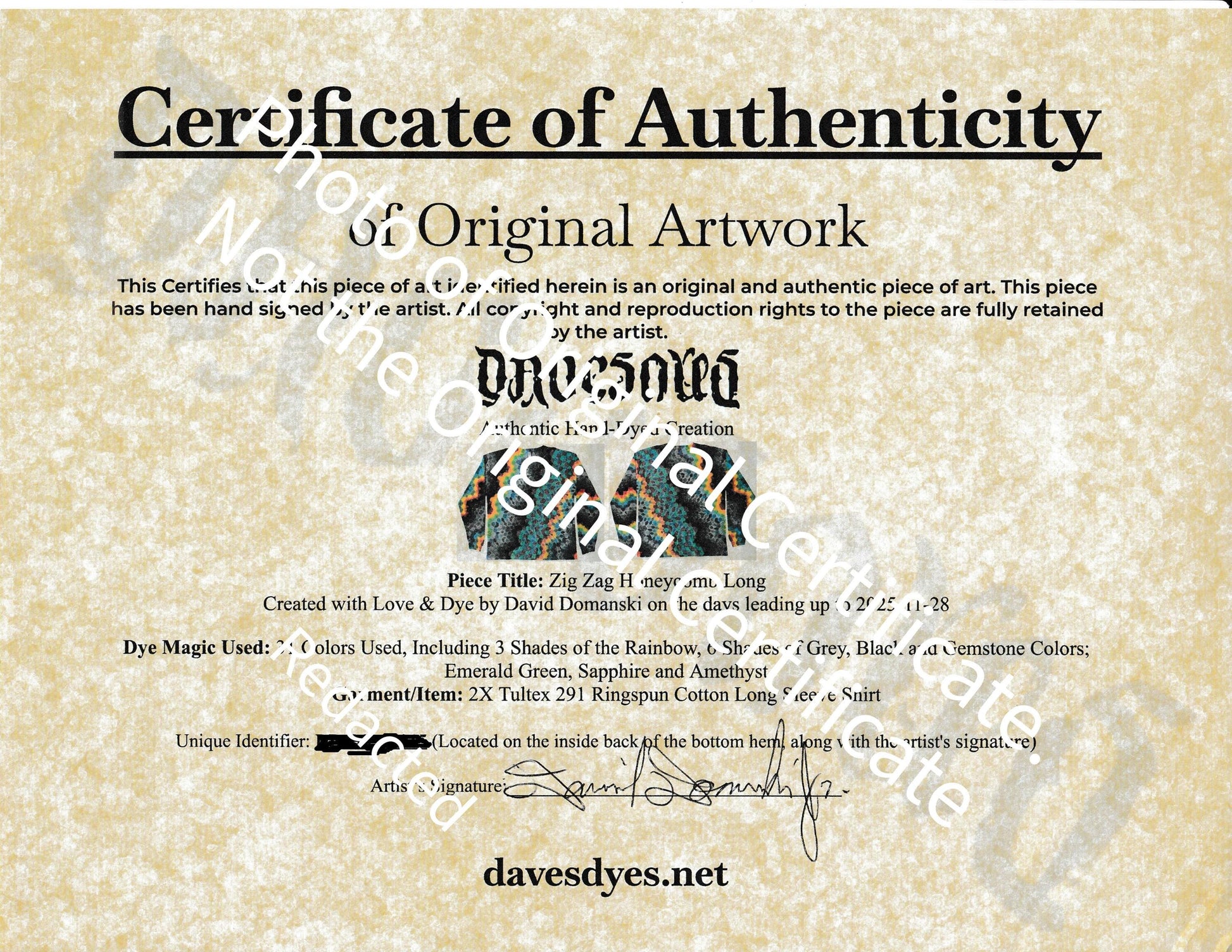 This piece of tie dye artwork comes with a certificate of authenticity, printed on quality parchment paper for certificates, by default from Dave's Dyes. From now on (starting 5/11/25), any newly created item priced at $150 or greater, will include a certificate of authenticity which will have information about the work, a photograph (at least one) of the piece and will have a unique identifier that will be written somewhere on the art with archival quality ink and will match the identifier on the certificate. Both will also include the artist's signature. Certificates of Authenticity are also available for work done prior and for items marked at lower than $150, upon request. I’ll try to make it an option on my stores. For now, message me to request one.