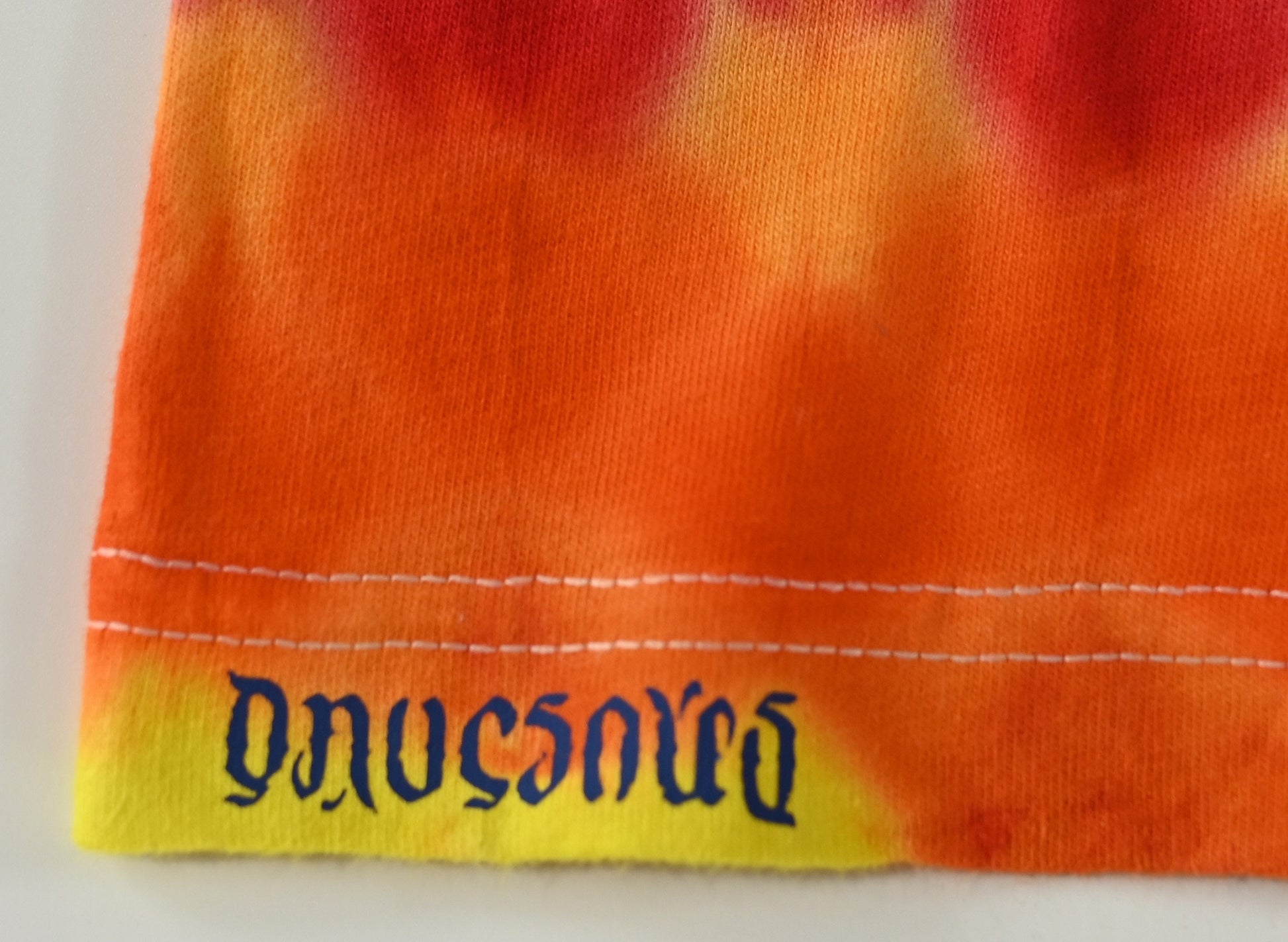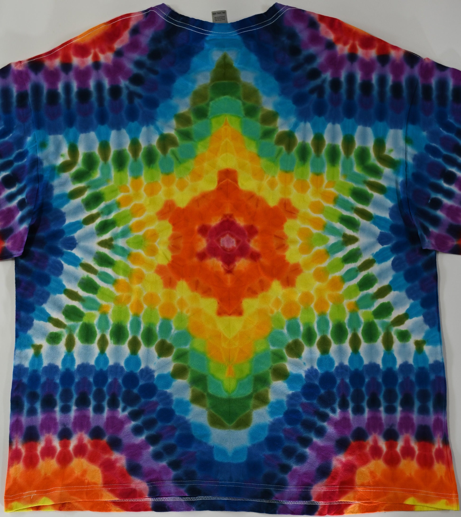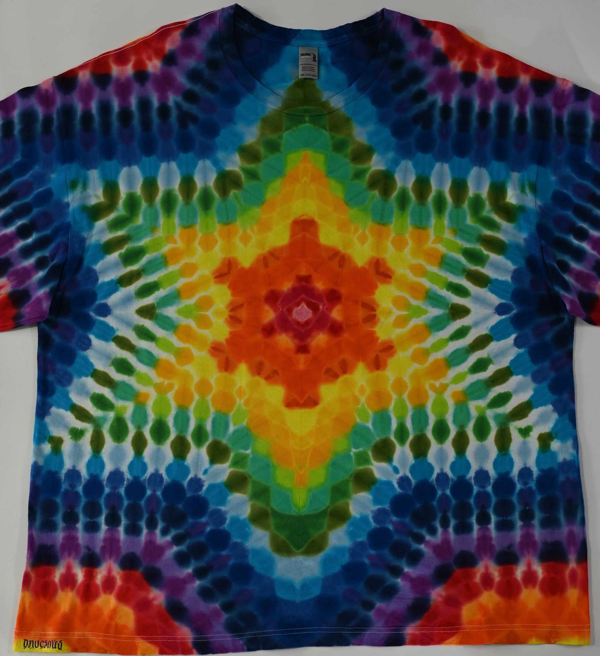 3X All Over, Centered Hexagram, Front/Back Tie Dye on a Gildan Hammer Ringspun Cotton Long Sleeve Shirt that was dyed using the "Pariah Method": The item was not presoaked in Soda Ash solution. The Procion Dyes were applied to the tied-up shirt and then a strong soda ash solution was applied after the dye was applied. It was then "batched" as normal for 48 hours before washout. This one has a blue HTV Dave's Dyes ambigram logo ironed on to the bottom hem. Feel free to ask me any questions you may have. Wash with like colors in cold water for first few washes. Below are the measurements that Gildan has for this Large, Long Sleeve shirt. Check the measurements