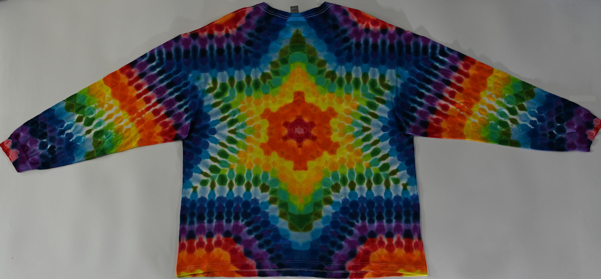 3X All Over, Centered Hexagram, Front/Back Tie Dye on a Gildan Hammer Ringspun Cotton Long Sleeve Shirt.