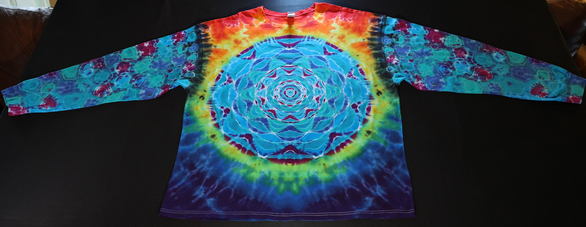 3X Heady 10 Point Sectional Mandala/Double Diamond Back Shield/Kenney Style Sleeves/Scrunch on a Premium Gildan Hammer Ringspun Cotton Long Sleeve Shirt that was soaked in soda ash prior to dyeing with Procion dyes. Feel free to ask me any questions you may have. Wash with like colors in cold water for first few washes.