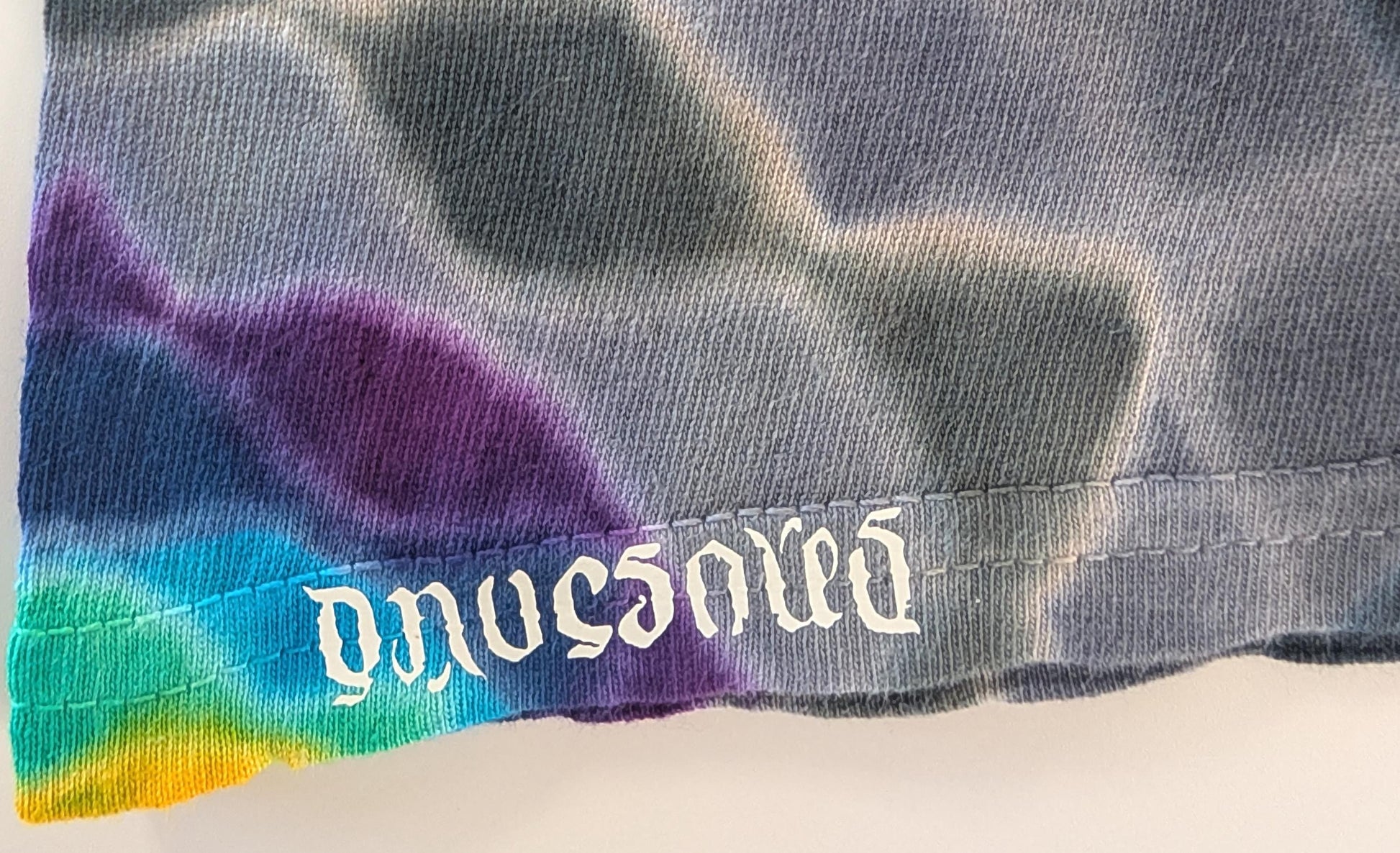 3X Zig Zag Honeycomb Tie Dye on a Gildan Ultra Cotton PFD (Prepared for Dye) T-Shirt that was dyed using the "Pariah Method": The item was not presoaked in Soda Ash solution. The Procion Dyes were applied to the tied-up shirt and then a strong soda ash solution was applied after the dye was applied. It was then "batched" as normal for 48 hours before washout. This one has a glow in the dark HTV Dave's Dyes ambigram logo ironed on to the bottom hem. Feel free to ask me any questions you may have. Wash with like colors in cold water for first few washes.