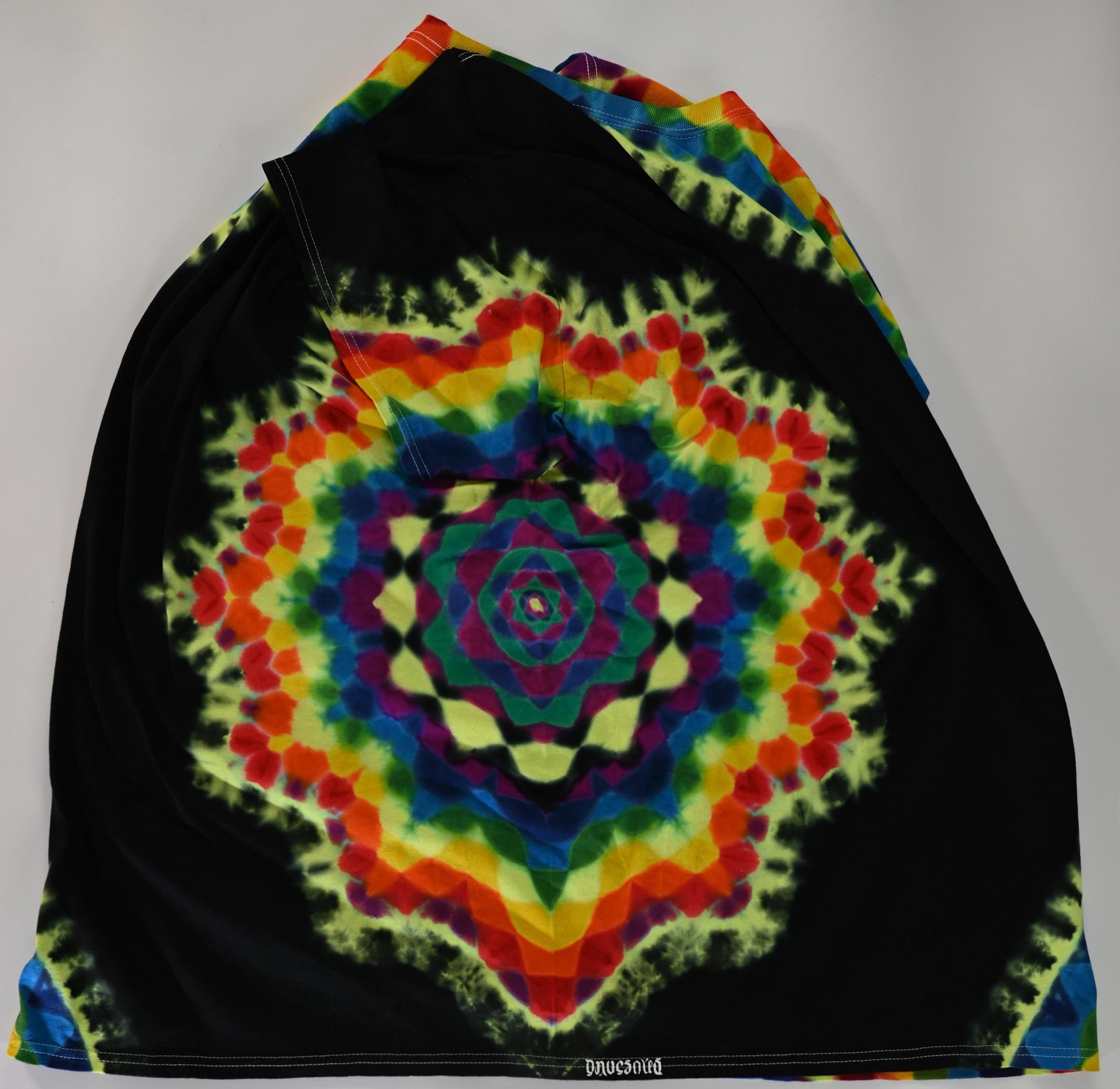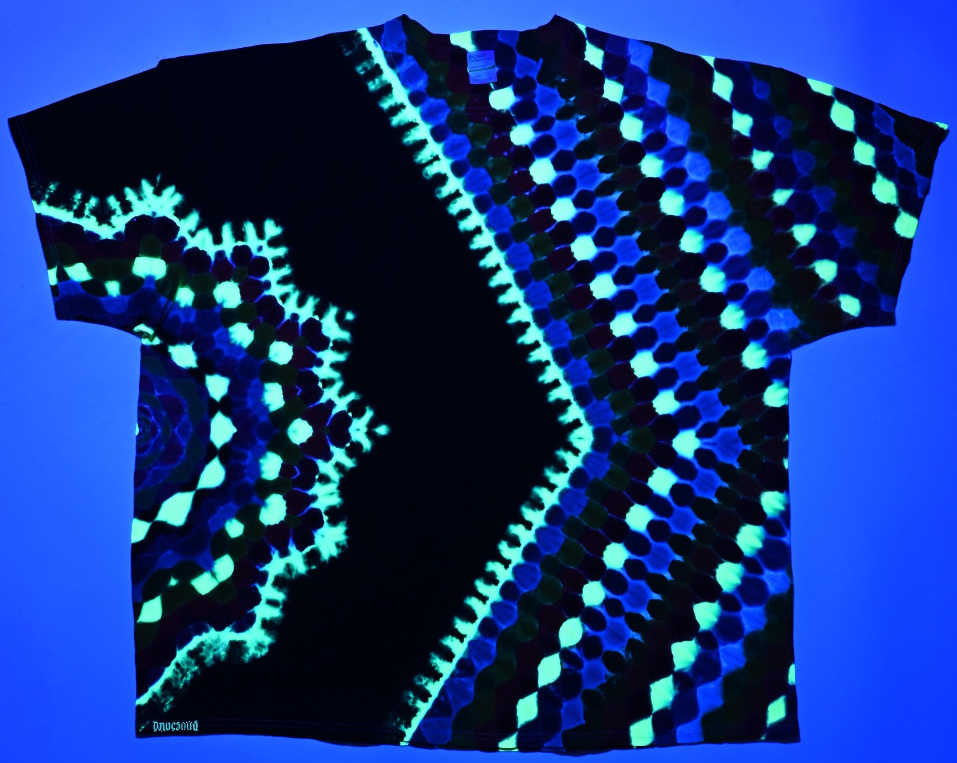 4X UV Reactive Side Hexagon (Gemstone Colors)-> {12/3} Dodecagram/Pac-Man Honeycomb w/Black Between Tie Dye on a Port & Company Essential Tee that was dyed using the "Pariah Method": The item was not presoaked in Soda Ash solution. The Procion Dyes were applied to the tied-up shirt and then a strong soda ash solution was applied after the dye was applied. (This piece was dyed, in part, using the only dye that is both UV Reactive and Fiber Reactive. Remazol Luminous Yellow FL AKA Psychedelic Sunshine. A Vinyl Sulfone reactive dye. Great effects in blacklight!) It was then "batched" as normal for 48 hours before washout. This one has a glow in the dark HTV Dave's Dyes ambigram logo ironed on to the bottom hem. Feel free to ask me any questions you may have. Wash with like colors in cold water for first few washes.