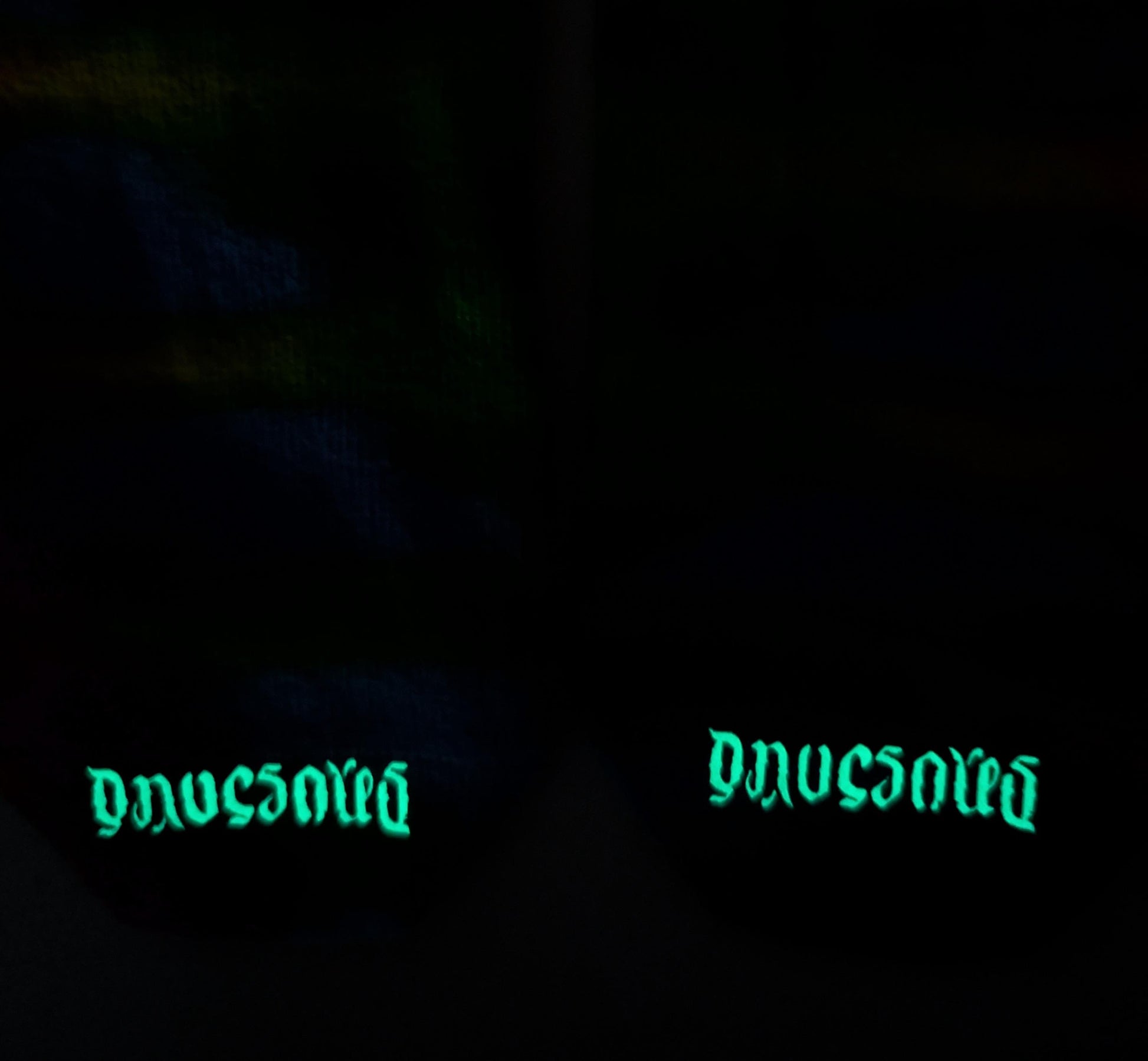 Colorful Tie Dye on a Pair of Dharma Trading Company Cotton Blend (89% Cotton/9 Nylon/2 Spandex) Thigh High Socks that were dyed using the "Pariah Method": The socks were not presoaked in Soda Ash solution. The Procion Dyes were applied to the tied-up socks and then a strong soda ash solution was applied after the dye was applied. They were then "batched" as normal for 48 hours before washout. They Have glow in the dark HTV Dave's Dyes ambigram logos ironed on to the top of the toe sections. Feel free to ask me any questions you may have. Wash with like colors in cold water for first few washes