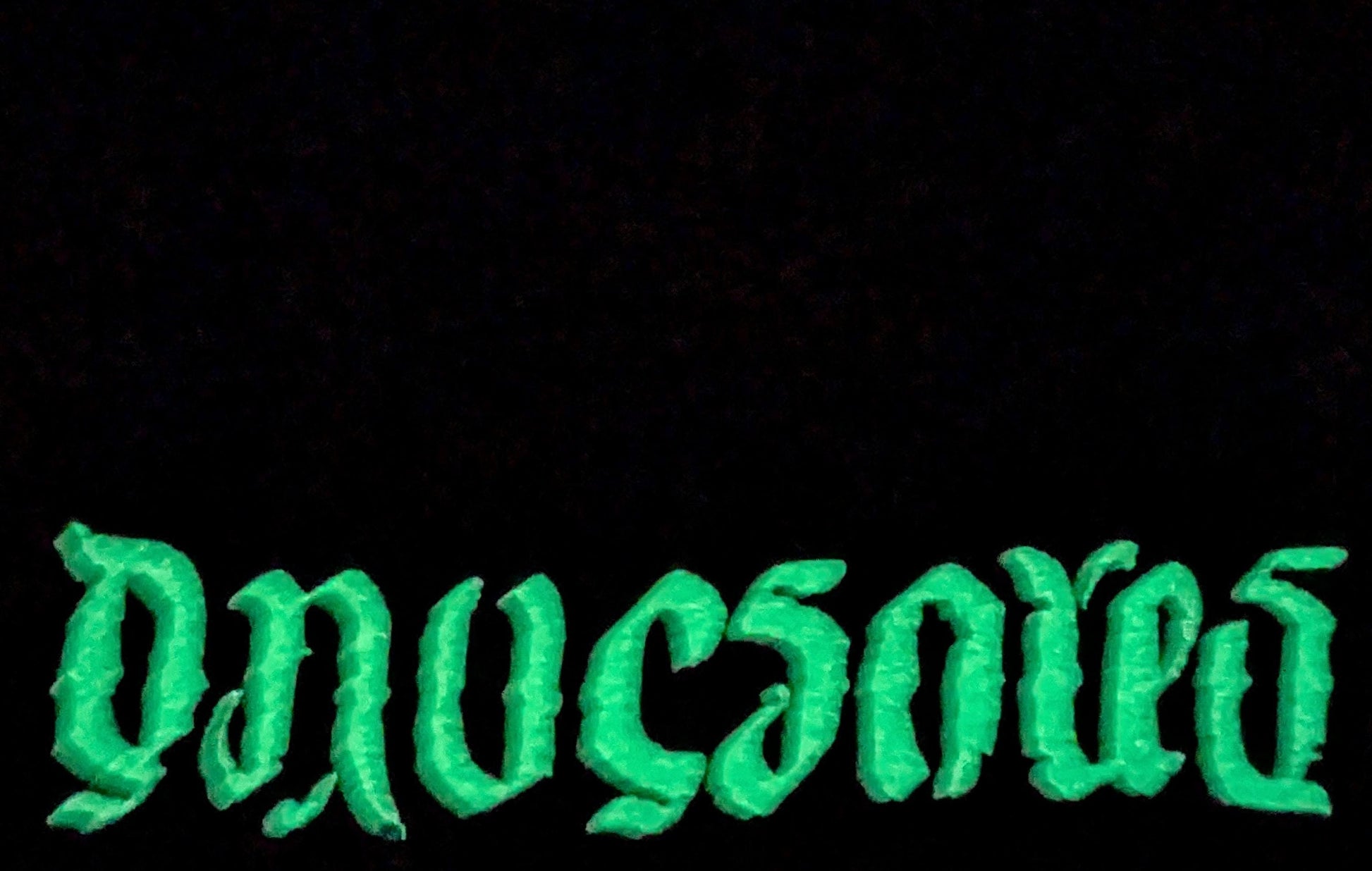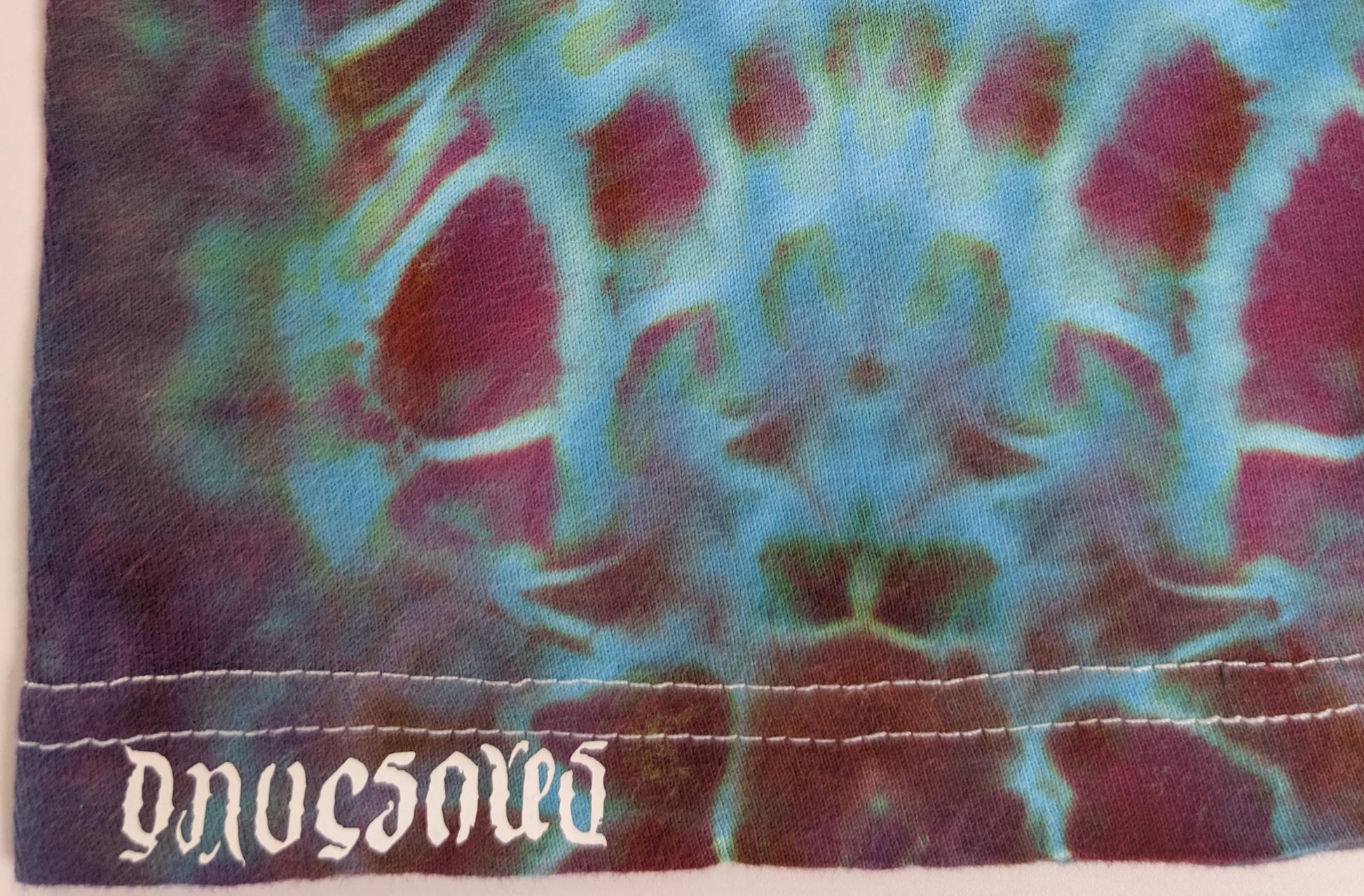 Medium Cosmic Egg/Geode Hybrid Ice Dye Tie Dye on a Tultex 291 Ringspun Cotton Long Sleeve Shirt that was ice dyed with Procion dyes. A healthy amount of soda ash was placed on top of the ice, so that the dye would find its place prior to the soda ash activating it. Similar to the Pariah Method. More concentrated soda ash/water mixture was also applied after all of the ice melted (Pariah style). The item was then batched for 48 hours after ice was melted. This one has a glow in the dark HTV Dave's Dyes ambigram logo ironed on to the bottom hem. Feel free to ask me any questions you may have. Wash with like colors in cold water for first few washes.