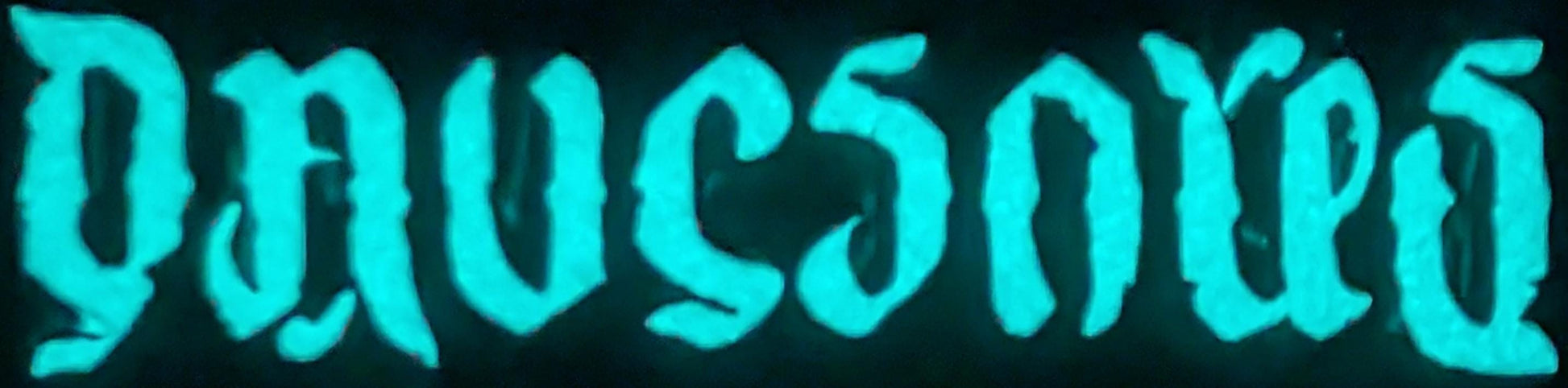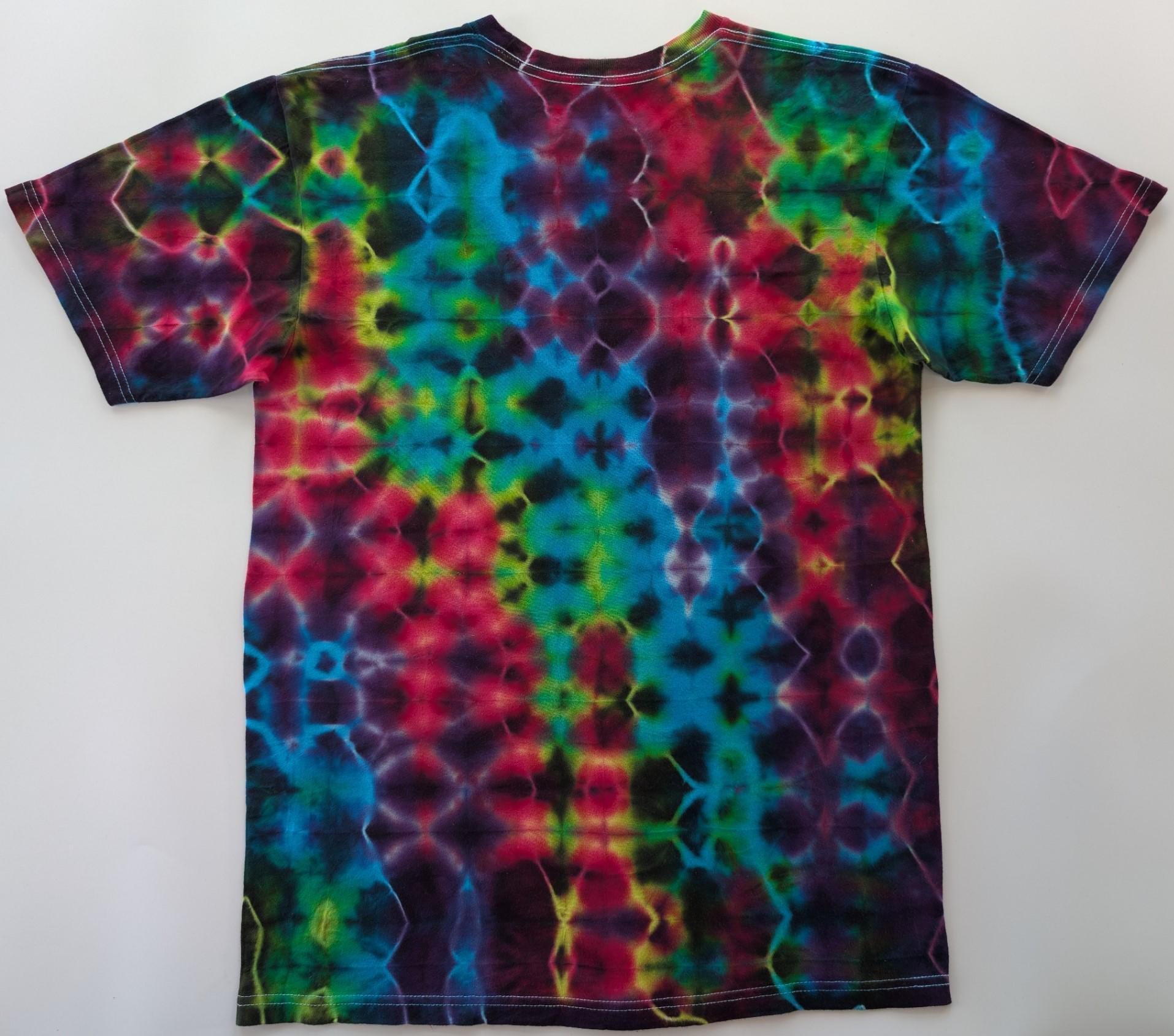 Medium Glitch Tie Dye on a Tultex 290 Ringspun Cotton T-Shirt that was dyed using the "Pariah Method": The item was not presoaked in Soda Ash solution. The Procion Dyes were applied to the tied-up shirt and then a strong soda ash solution was applied after the dye was applied. It was then "batched" as normal for 48 hours before washout. This one has a glow in the dark HTV Dave's Dyes ambigram logo ironed on to the bottom hem. Feel free to ask me any questions you may have. Wash with like colors in cold water for first few washes.