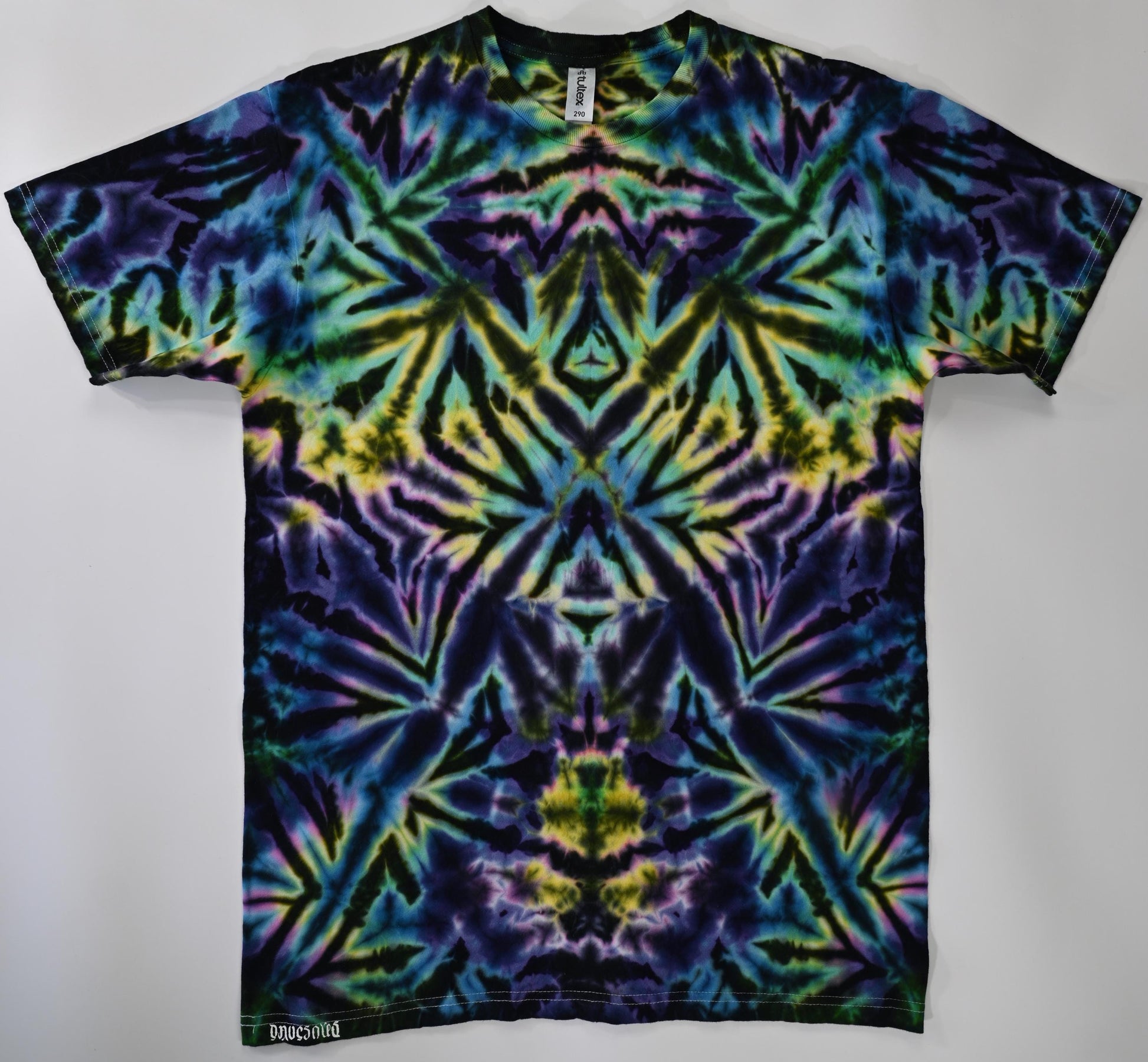 Medium Quantum Scrunch Tie Dye using my Neon Candy Nebula Color Palette on a Tultex 290 Ringspun Cotton T-Shirt Liquid dye was applied to the shirt without soaking in soda ash and sat for two hours. I then dumped in hot soda ash water to cover and allowed to soak another hour before rinsing and washing. This one has a glow in the dark HTV Dave's Dyes ambigram logo ironed on to the bottom hem. Feel free to ask me any questions you may have. Wash with like colors in cold water for first few washes.