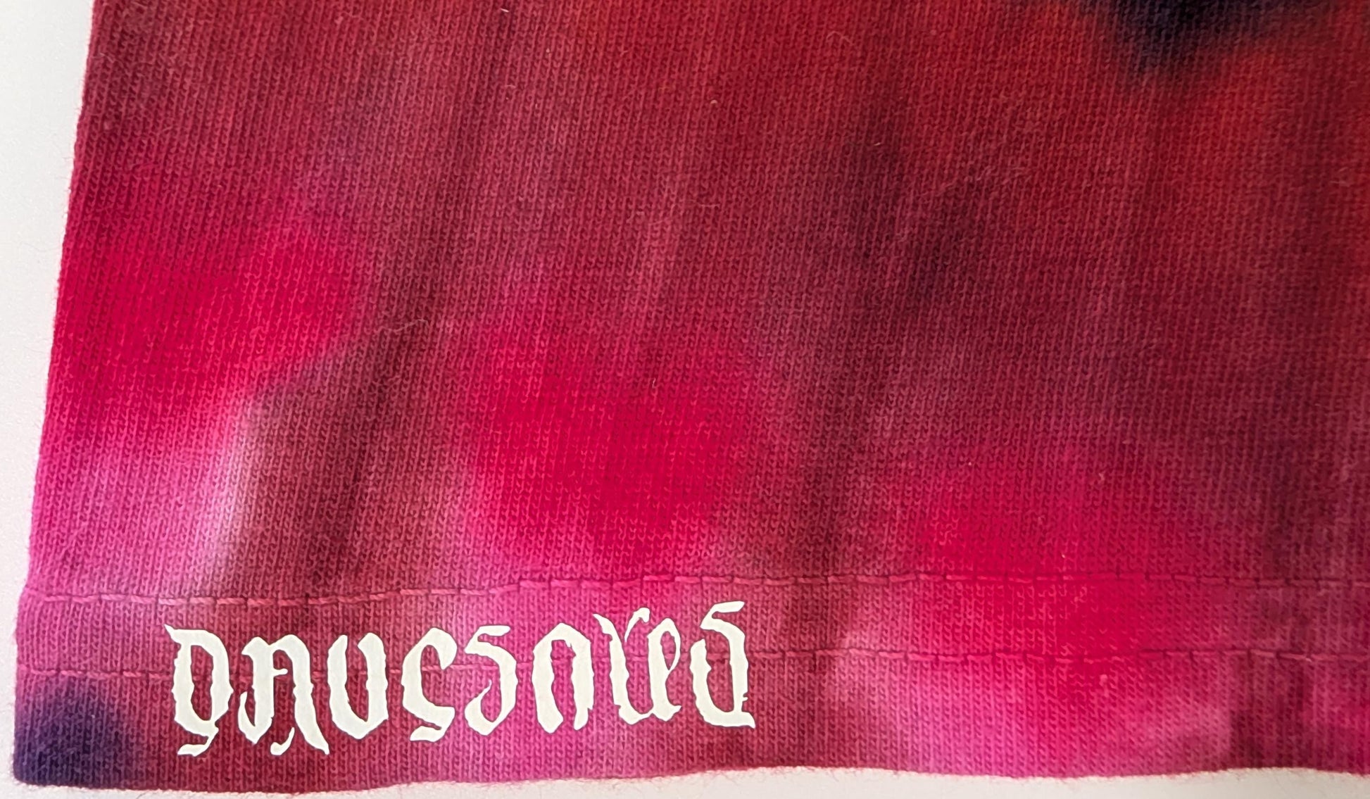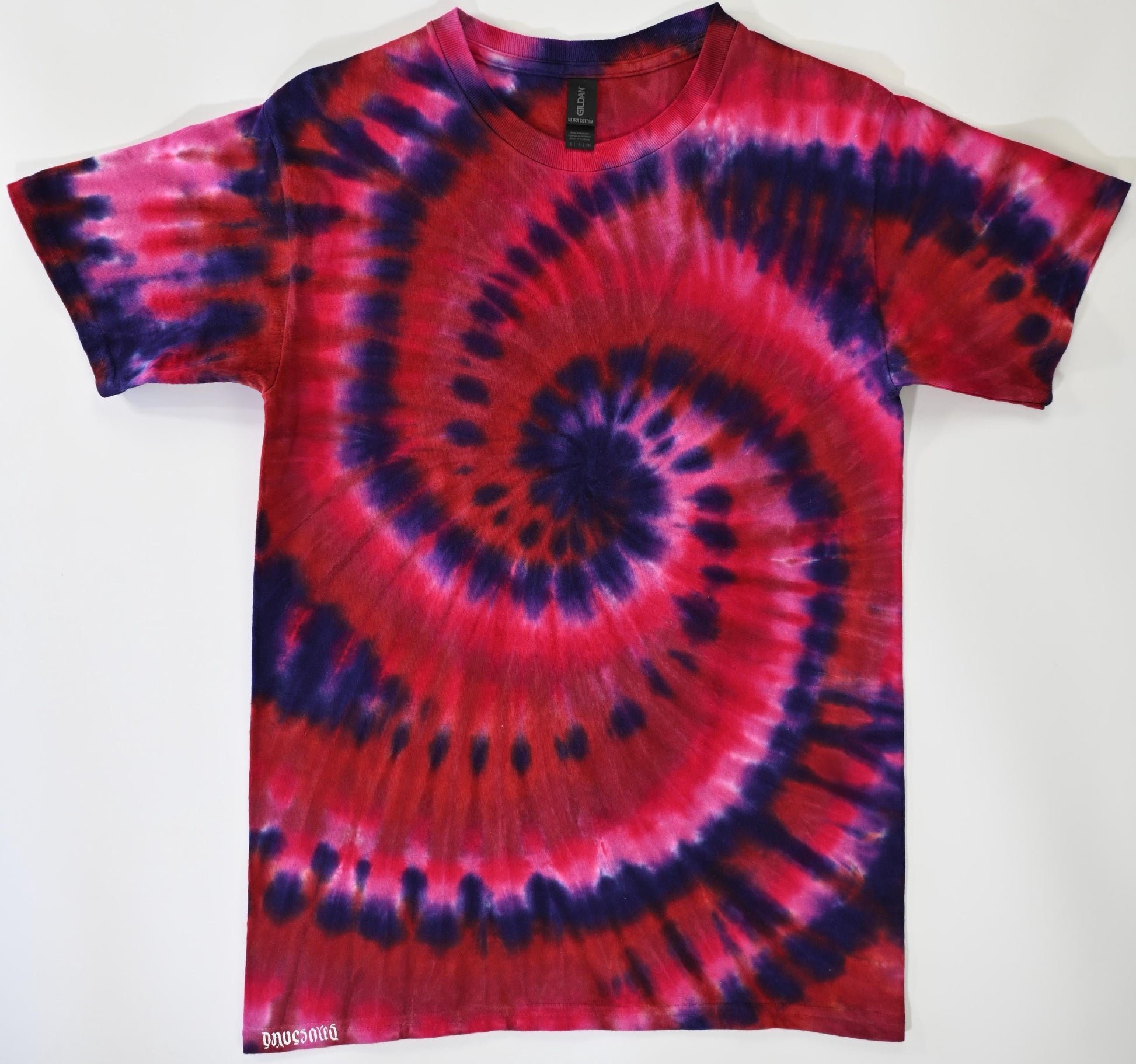 Small Spiral "Crystal Wash" Low Water Immersion Tie Dye using my Ethereal Attraction Color Palette on a Gildan Ultra Cotton PFD (Prepared for Dye) T-Shirt. Liquid dye was applied to the shirt without soaking in soda ash and sat for two hours. I then dumped in warm soda ash water to cover and allowed to soak another two hours before rinsing and washing. This one has a glow in the dark HTV Dave's Dyes ambigram logo ironed on to the hem the bottom. Feel free to ask me any questions you may have. Wash with like colors in cold water for first few washes.