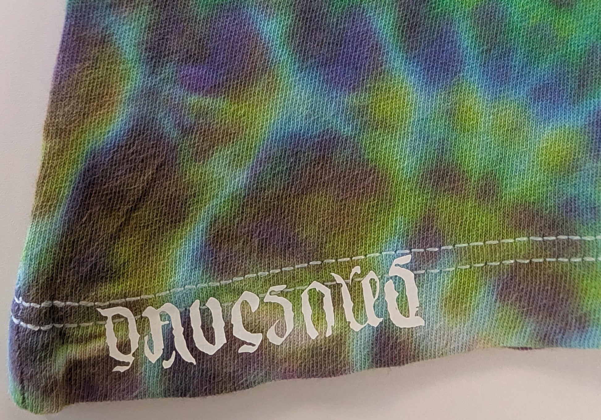 Women's Medium Cosmic Egg/Geode Hybrid Tie Dye on a District Very Important Tee V-Neck Cotton T-Shirt that was dyed using the "Pariah Method": The item was not presoaked in Soda Ash solution. The Procion Dyes were applied to the tied-up shirt and then a strong soda ash solution was applied after the dye was applied. It was then "batched" as normal for 48 hours before washout. This one has a glow in the dark HTV Dave's Dyes ambigram logo ironed on to the hem of the bottom. Feel free to ask me any questions you may have. Wash with like colors in cold water for first few washes.