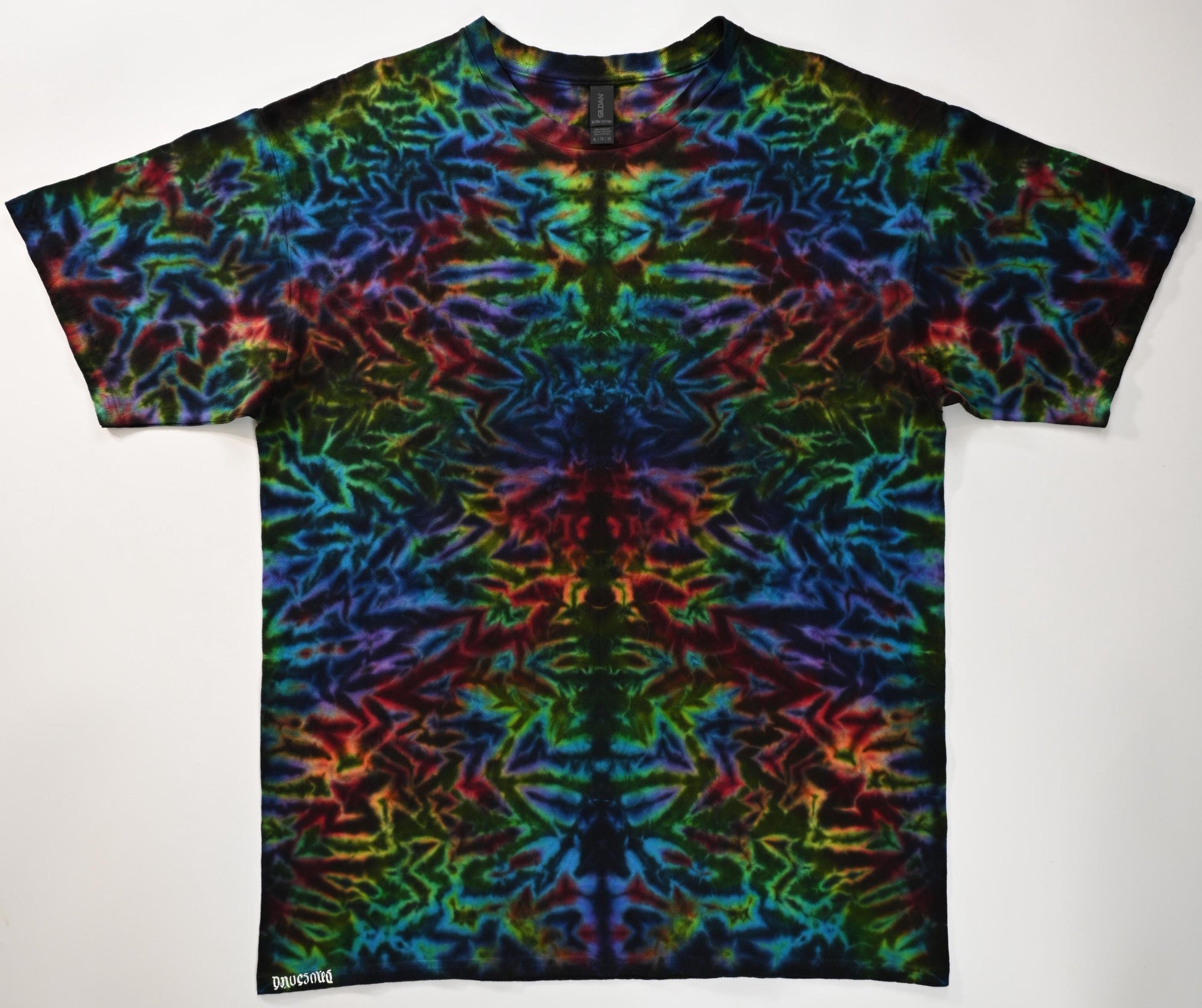 XL Blacked Out Rainbow Rorschach Scrunch Tie Dye on a Gildan Ultra Cotton PFD (Prepared for Dye) T-Shirt that was dyed using the "Pariah Method": The item was not presoaked in Soda Ash solution. The Procion Dyes were applied to the tied-up shirt and then a strong soda ash solution was applied after the dye was applied. It was then "batched" as normal for 48 hours before washout. This one has a glow in the dark HTV Dave's Dyes ambigram logo ironed on to the bottom hem. Feel free to ask me any questions you may have. Wash with like colors in cold water for first few washes