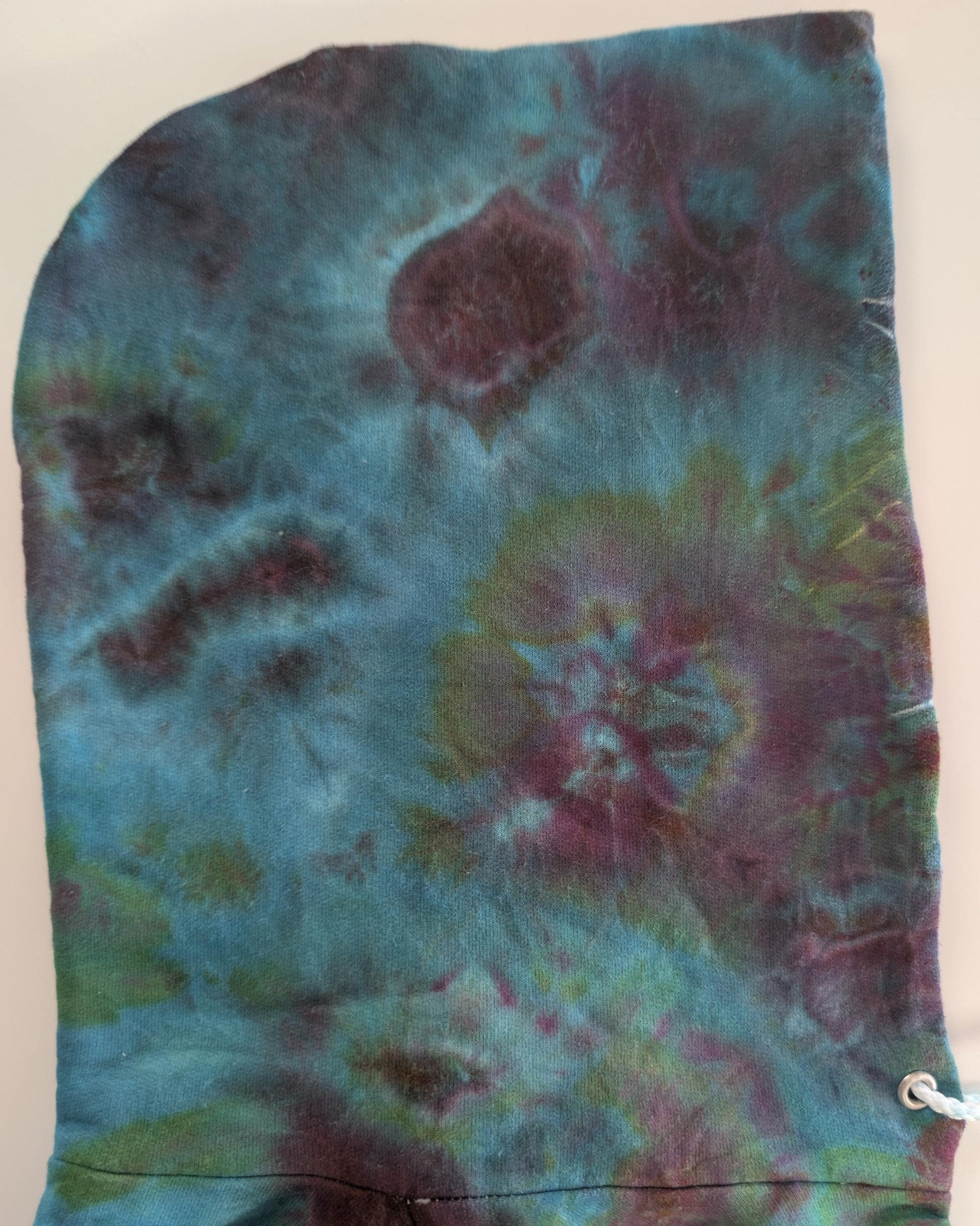 XL Geode Ice Dye Tie Dye on a Hanes Ultimate Cotton Pullover Hoodie that was ice dyed with Procion dyes. A healthy amount of soda ash was placed on top of the ice, so that the dye would find its place prior to the soda ash activating it. Similar to the Pariah Method. More concentrated soda ash/water mixture was also applied after all of the ice melted (Pariah style). The item was then batched for 48 hours after ice was melted. This one has a glow in the dark HTV Dave's Dyes ambigram logo ironed on to the front of the hood section. Feel free to ask me any questions you may have. Wash with like colors in cold water for first few washes.