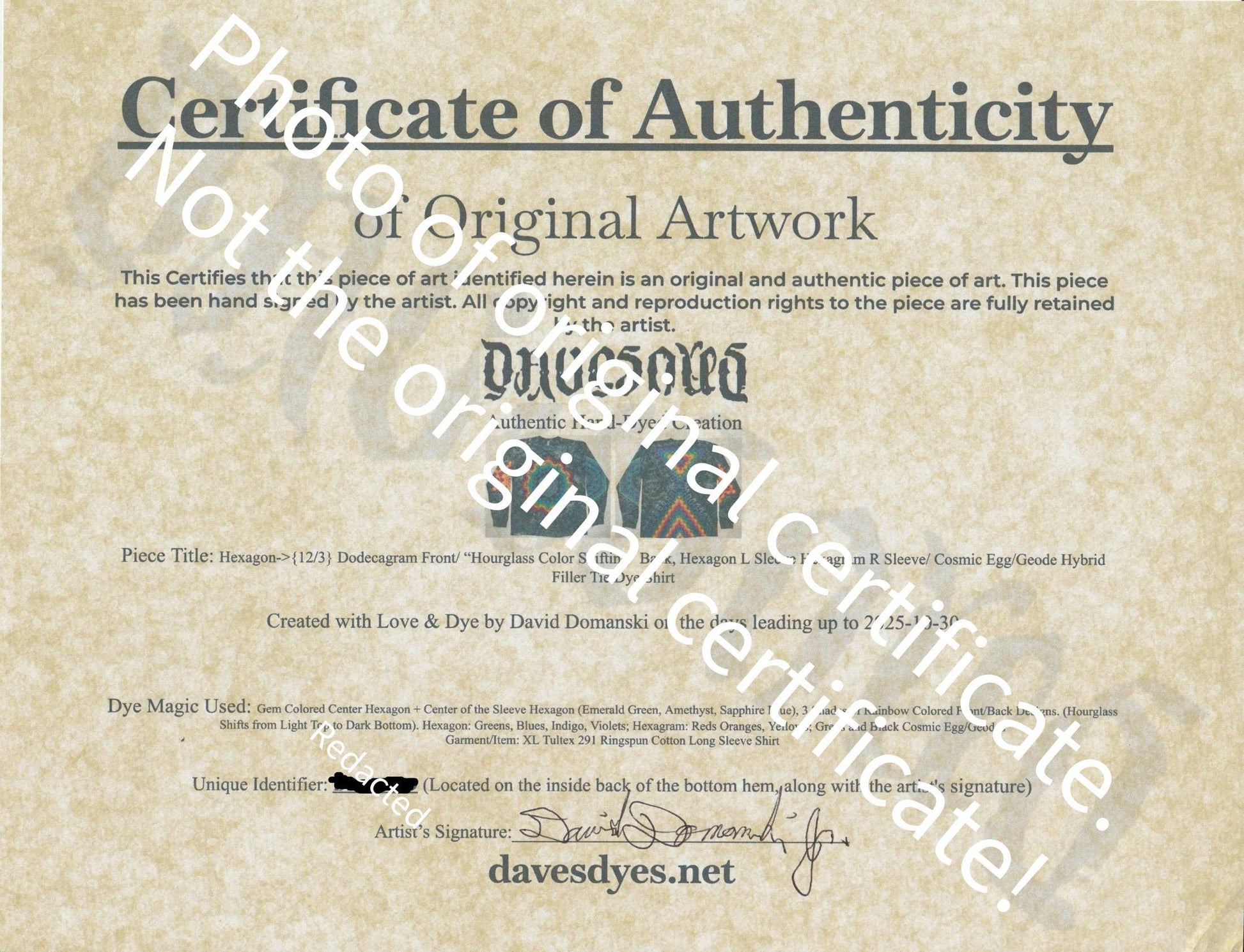This piece of tie dye artwork comes with a certificate of authenticity, printed on quality parchment paper for certificates, by default from Dave's Dyes. From now on (starting 5/11/25), any newly created item priced at $150 or greater, will include a certificate of authenticity which will have information about the work, a photograph (at least one) of the piece and will have a unique identifier that will be written somewhere on the art with archival quality ink and will match the identifier on the certificate. Both will also include the artist's signature. Certificates of Authenticity are also available for work done prior and for items marked at lower than $150, upon request. I’ll try to make it an option on my stores. For now, message me to request one.