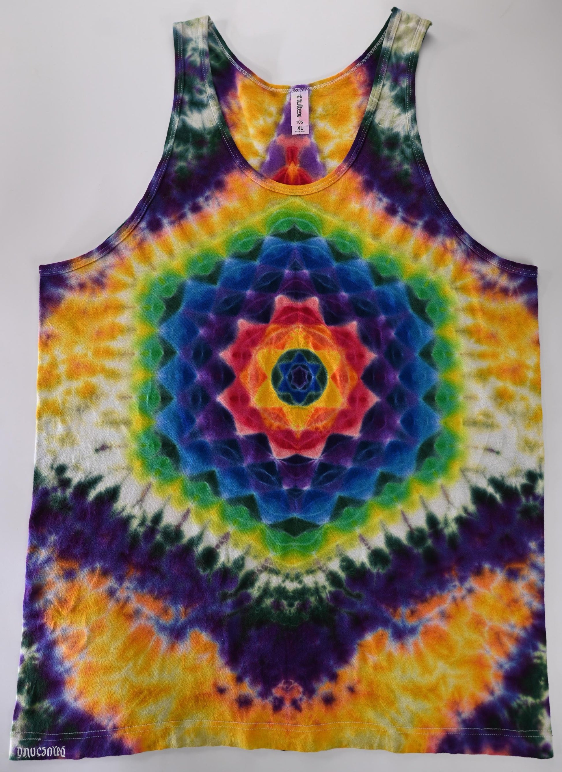 XL Hexagon Front/Triangle Back Piece/Scrunch filler in Aphrodisiac Palette Tie Dye on a Tultex 105 Ringspun Cotton Tank Top that was dyed using the "Pariah Method": The item was not presoaked in Soda Ash solution. The Procion Dyes were applied to the tied-up shirt and then a strong soda ash solution was applied after the dye was applied. It was then "batched" as normal for 48 hours before washout. This one has a glow in the dark HTV Dave's Dyes ambigram logo ironed on to the bottom hem. Feel free to ask me any questions you may have. Wash with like colors in cold water for first few washes.