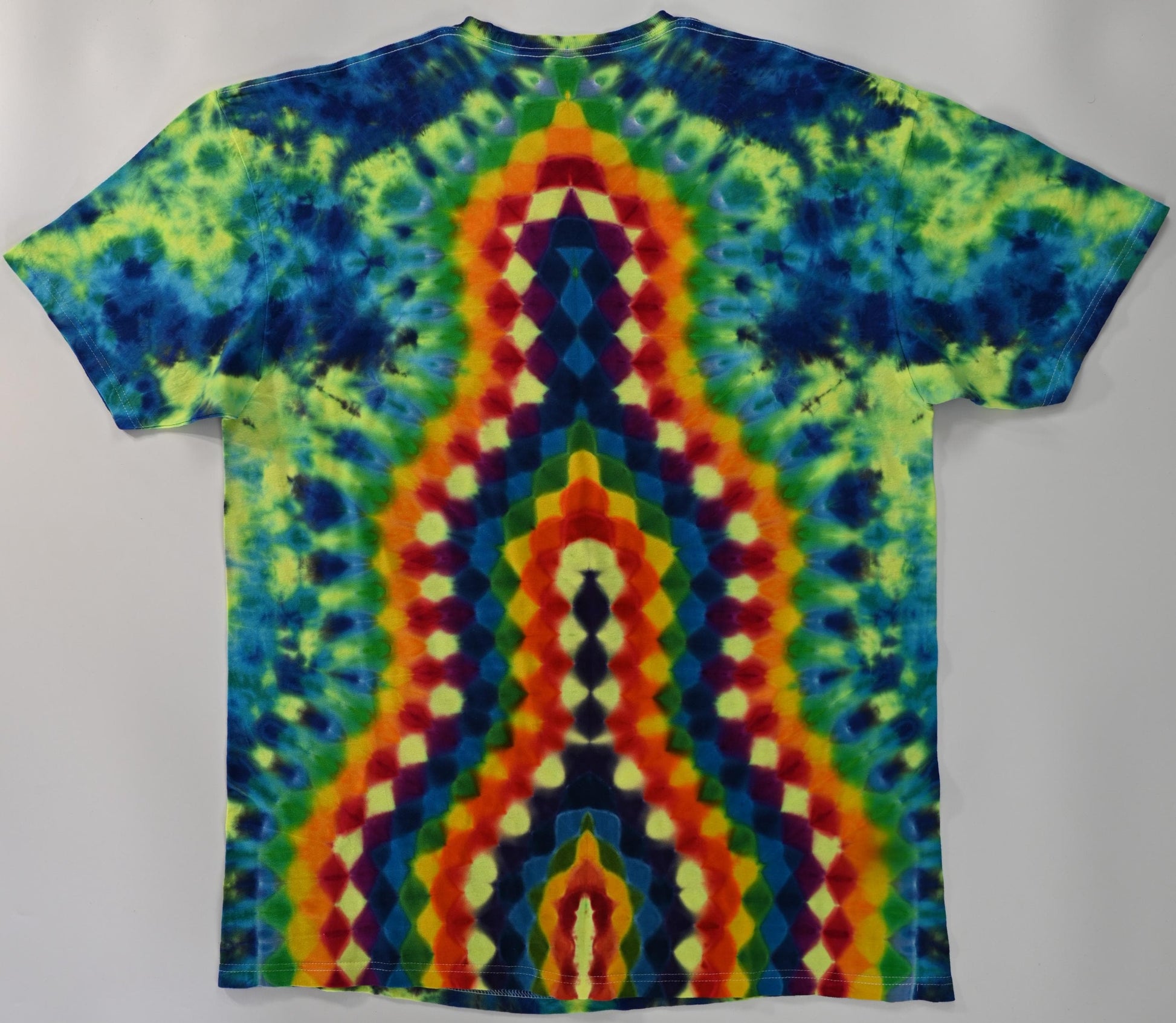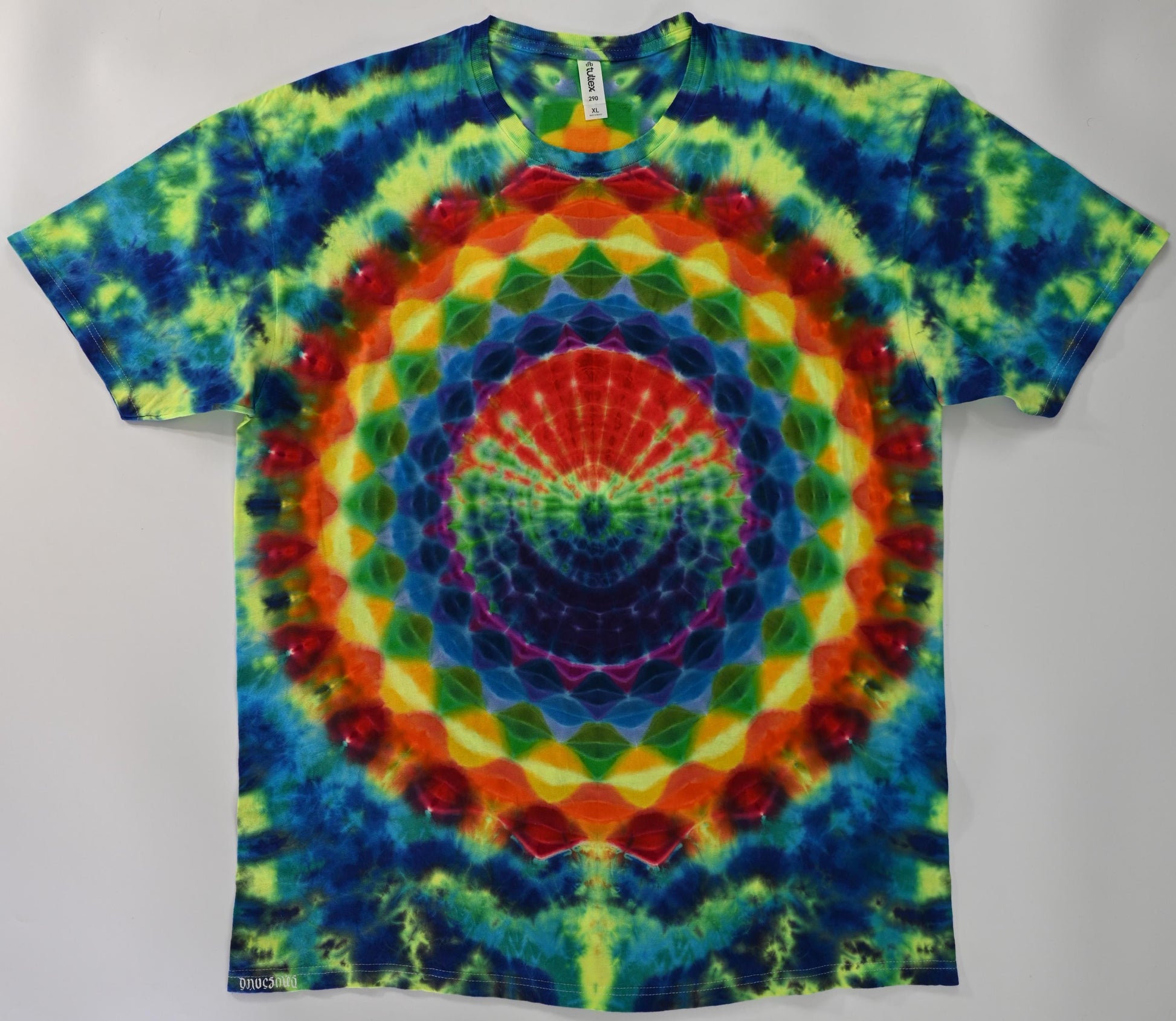 XL Super Heady UV Reactive 20Pt Mandala w/ Ripple Center F/Geometric Tower B Shield/Scrunch Tie Dye on a Tultex 290 Ringspun Cotton T-Shirt