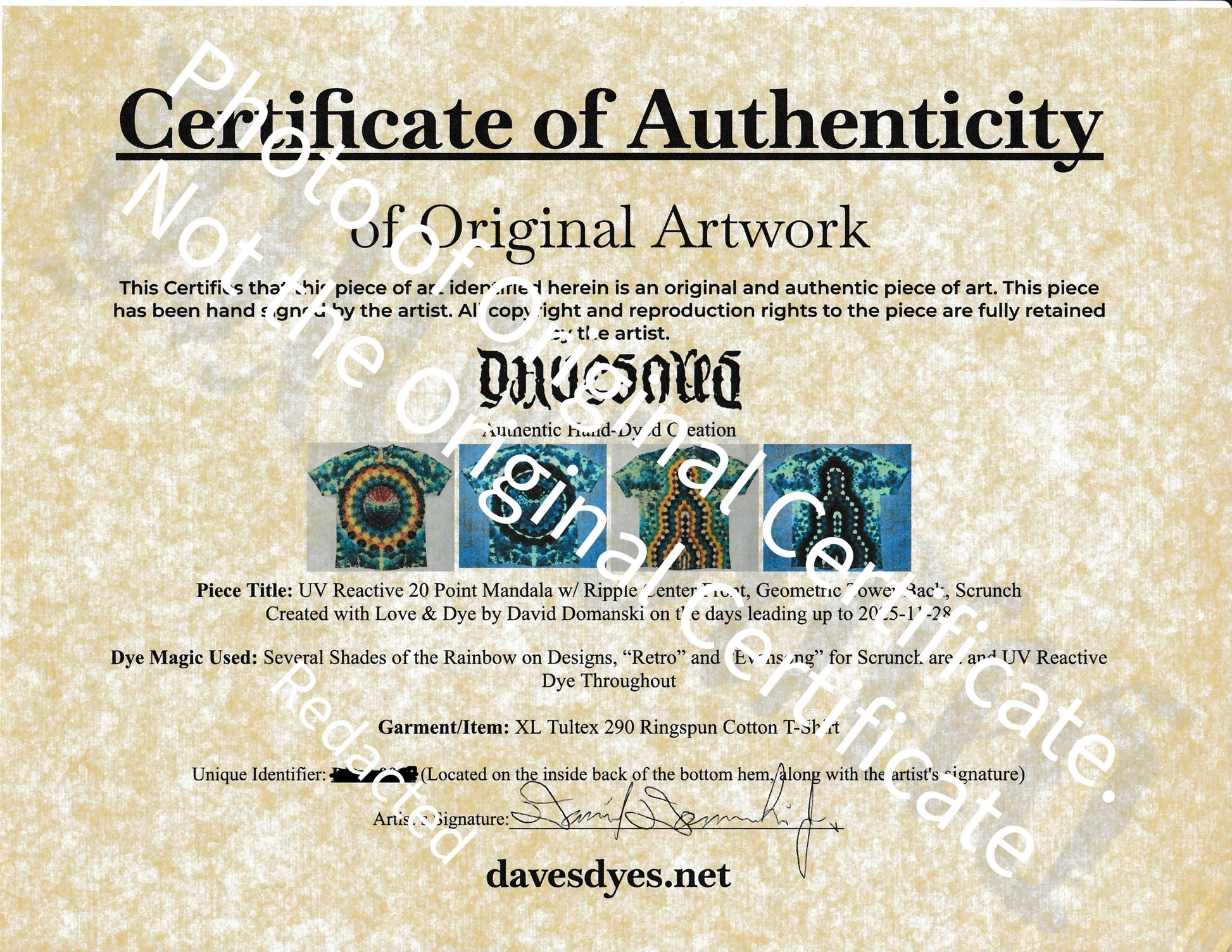 This piece of tie dye artwork comes with a certificate of authenticity, printed on quality parchment paper for certificates, by default from Dave's Dyes. From now on (starting 5/11/25), any newly created item priced at $150 or greater, will include a certificate of authenticity which will have information about the work, a photograph (at least one) of the piece and will have a unique identifier that will be written somewhere on the art with archival quality ink and will match the identifier on the certificate. Both will also include the artist's signature. Certificates of Authenticity are also available for work done prior and for items marked at lower than $150, upon request. I’ll try to make it an option on my stores. For now, message me to request one.