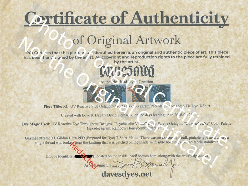 This piece of tie dye artwork comes with a certificate of authenticity, printed on quality parchment paper for certificates, by default from Dave's Dyes. From now on (starting 5/11/25), any newly created item priced at $150 or greater, will include a certificate of authenticity which will have information about the work, a photograph (at least one) of the piece and will have a unique identifier that will be written somewhere on the art with archival quality ink and will match the identifier on the certificate. Both will also include the artist's signature. Certificates of Authenticity are also available for work done prior and for items marked at lower than $150, upon request. I’ll try to make it an option on my stores. For now, message me to request one.