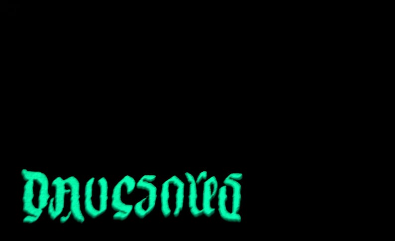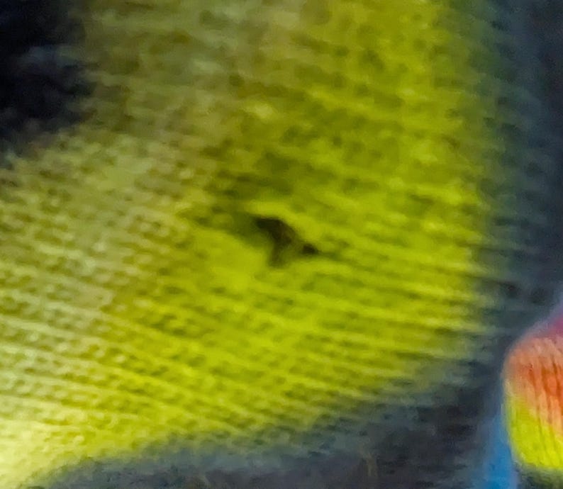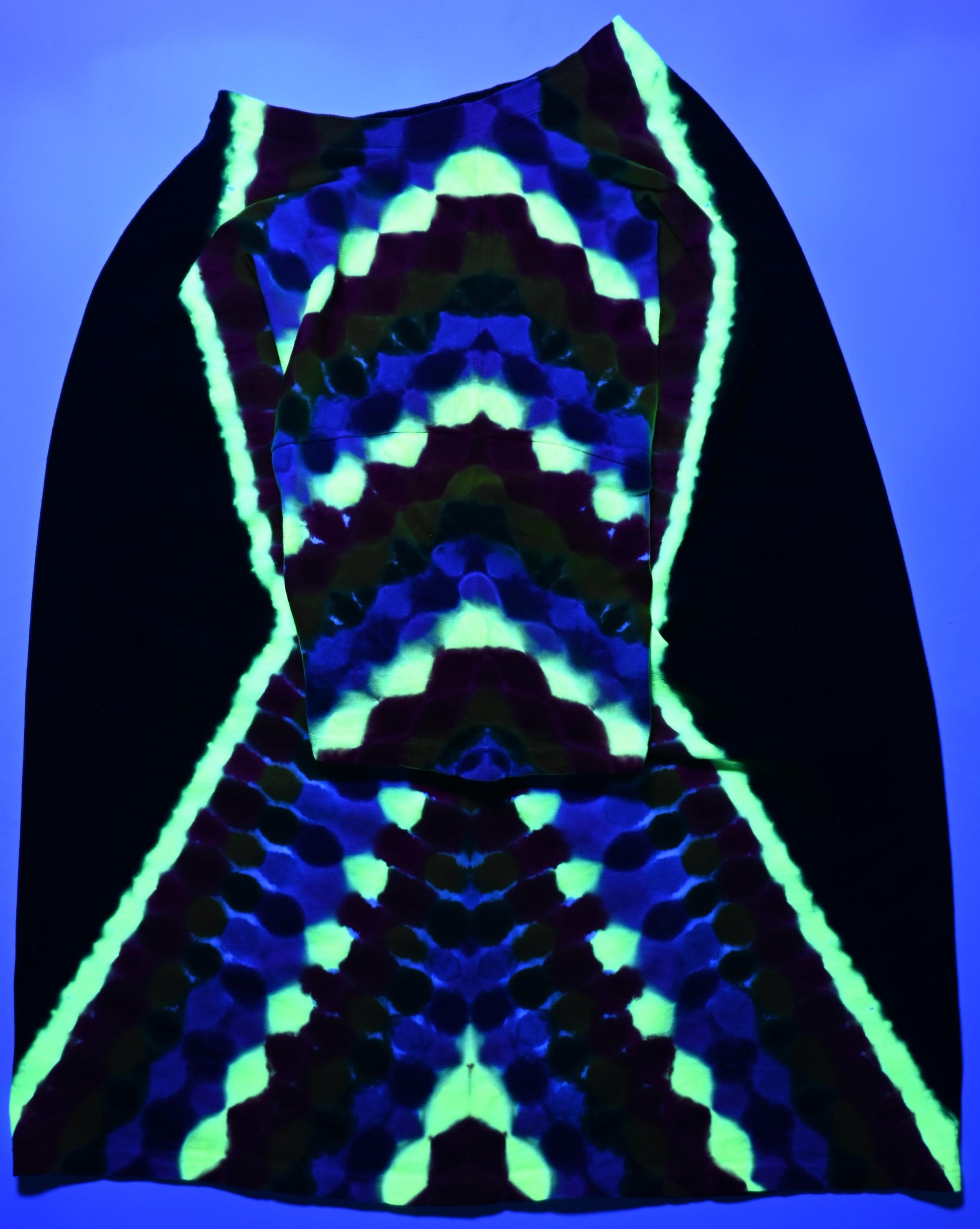 *There was an incredibly minor little defect on this shirt that I patched up. Most people probably wouldn't have noticed it. On the back side, in the section where the UV dye is around the octagon, a single thread was broken from the knitting. I patched on the inside with fusible bonding web and fabric stabilizer. See pics.