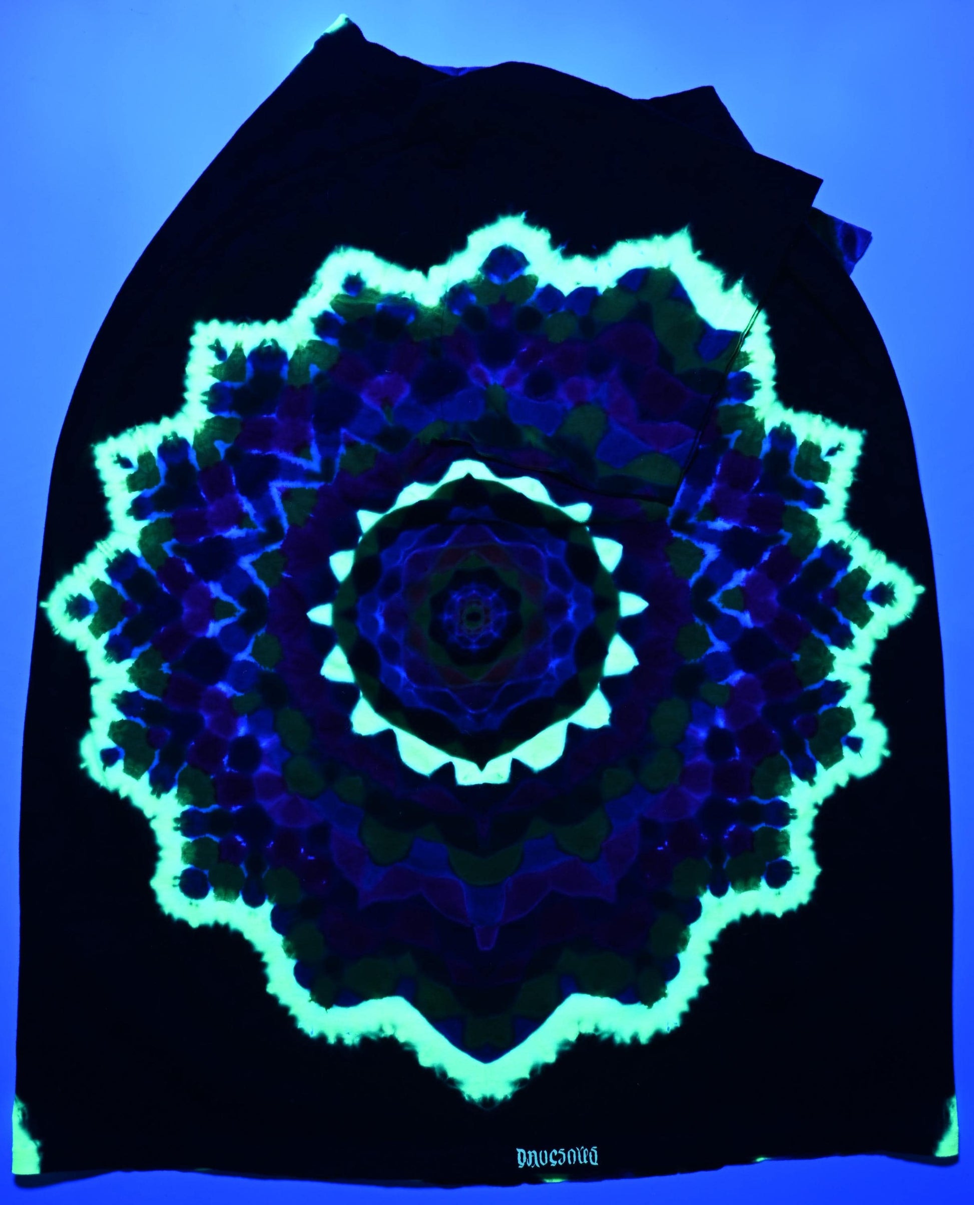 XL UV Reactive Side Octagon (Psychedelic Vision Palette)>{16/4} Hexadecagram (Ethereal Pulse Palette)/Pac-Man Honeycomb (Rainbow)/Black Filler Tie Dye on a Gildan Ultra Cotton PFD (Prepared for Dye) T-Shirt* that was dyed using the "Pariah Method": The item was not presoaked in Soda Ash solution. The Procion Dyes (This piece was dyed, in part, using the only dye that is both UV Reactive and Fiber Reactive. Remazol Luminous Yellow FL AKA Psychedelic Sunshine. A Vinyl Sulfone reactive dye. Great effects in blacklight!) were applied to the tied-up shirt and then a strong soda ash solution was applied after the dye was applied. It was then "batched" as normal for 48 hours before washout. This one has a glow in the dark HTV Dave's Dyes ambigram logo ironed on to the hem of the bottom. Feel free to ask me any questions you may have. Wash with like colors in cold water for first few washes.