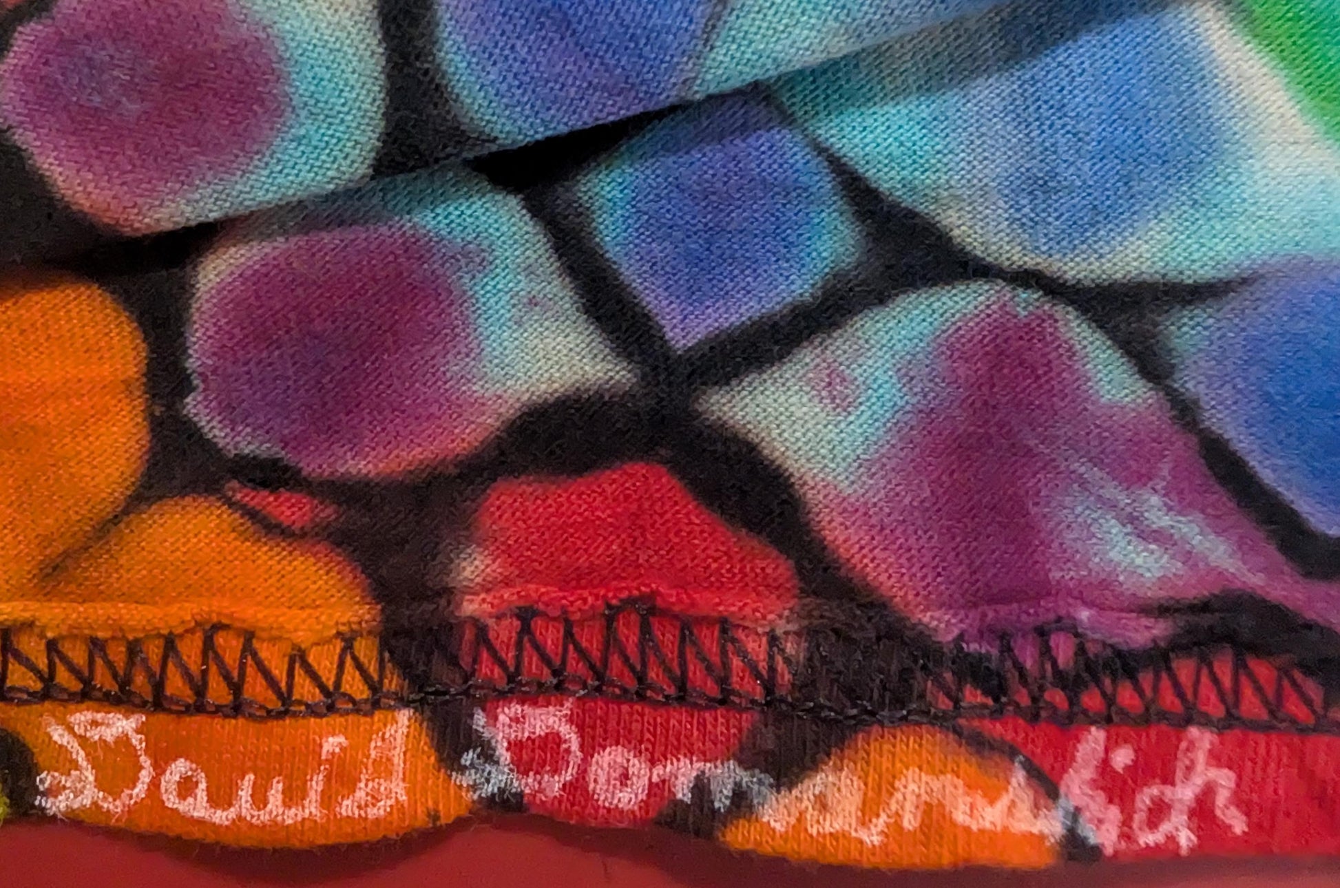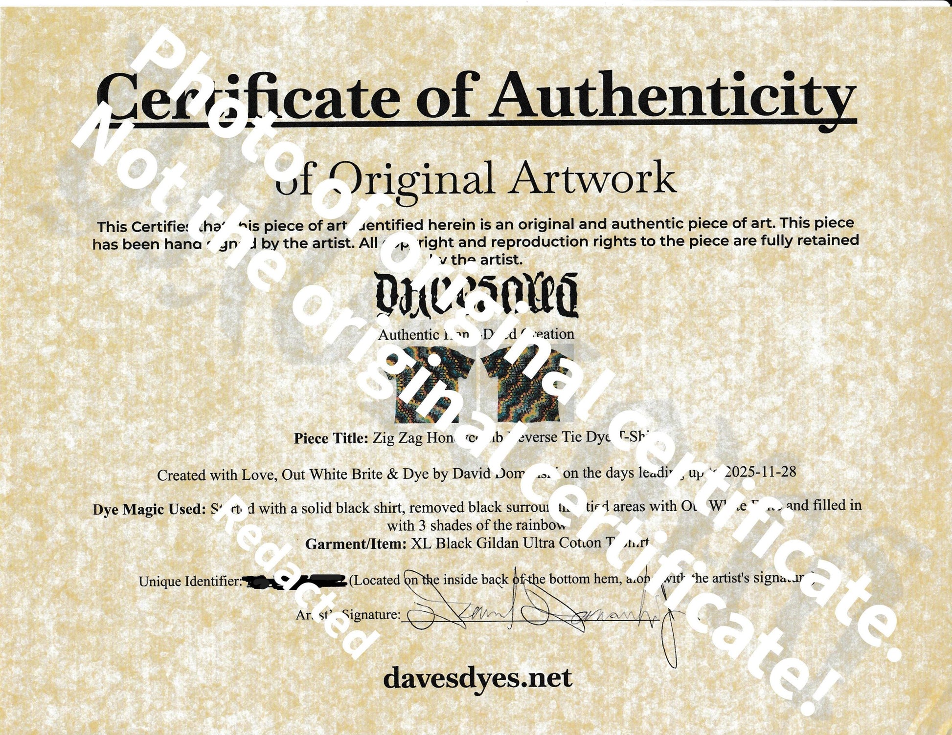 This piece of tie dye artwork comes with a certificate of authenticity, printed on quality parchment paper for certificates, by default from Dave's Dyes. From now on (starting 5/11/25), any newly created item priced at $150 or greater, will include a certificate of authenticity which will have information about the work, a photograph (at least one) of the piece and will have a unique identifier that will be written somewhere on the art with archival quality ink and will match the identifier on the certificate. (I wrote the identifier on 2 spots on the inside back of the bottom hem in both whit and black archival ink. Signature in white) Both will also include the artist's signature. Certificates of Authenticity are also available for work done prior and for items marked at lower than $150, upon request. I’ll try to make it an option on my stores. For now, message me to request one.