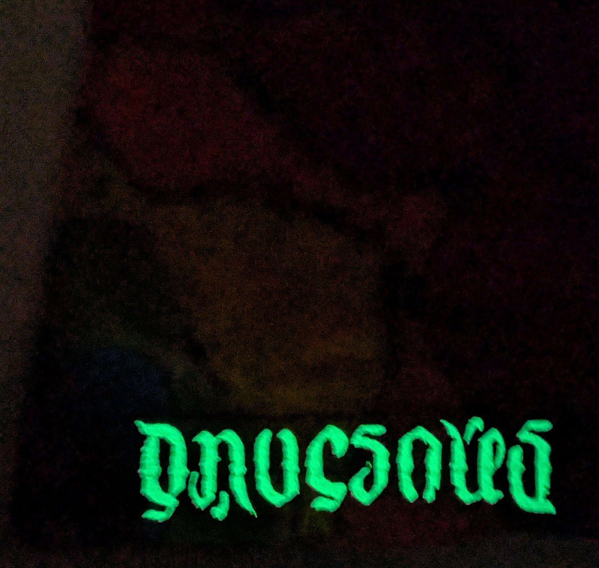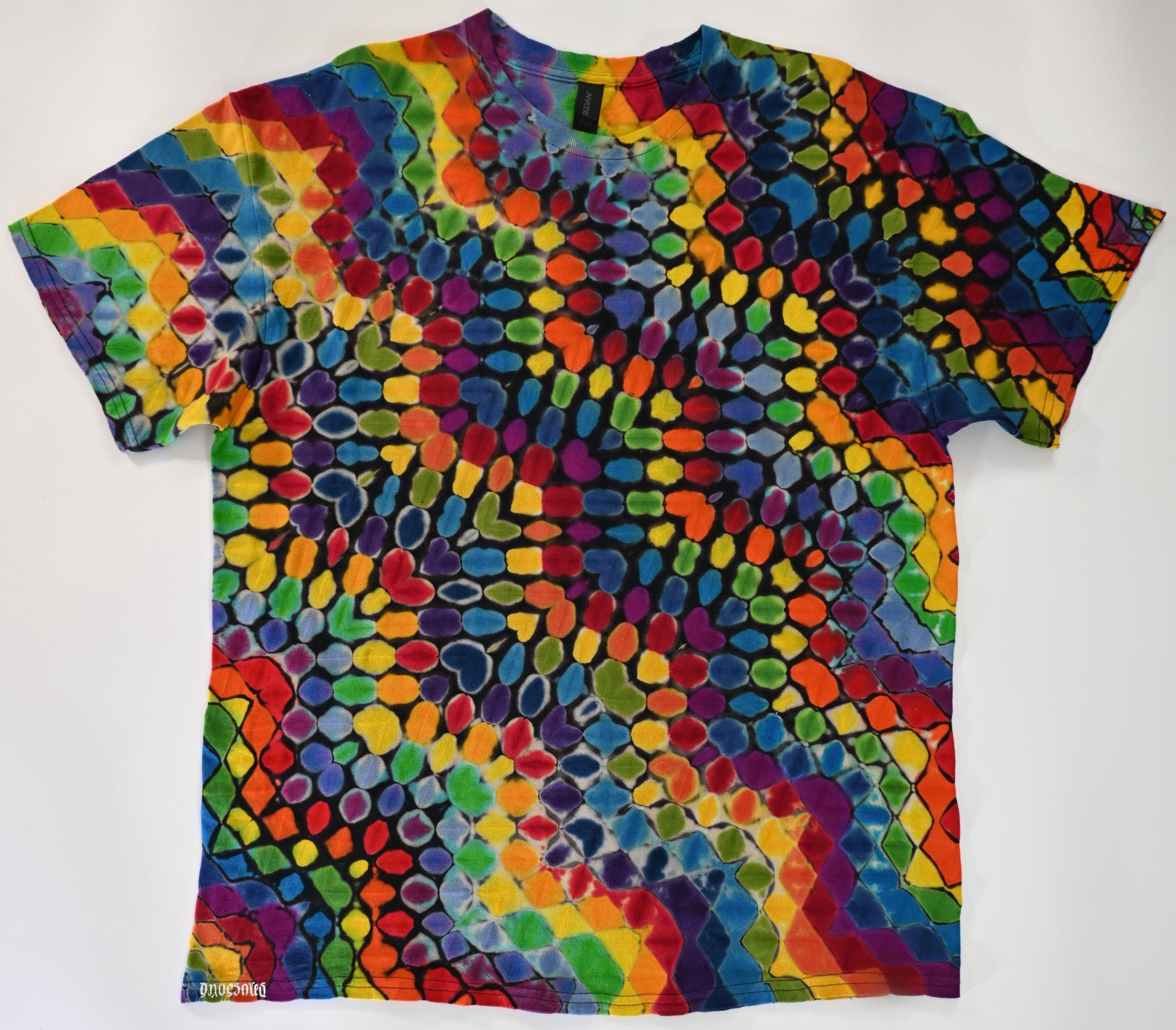 XL Zig Zag Honeycomb Reverse Tie Dye on what was once an all Black Gildan Ultra Cotton T-Shirt that was reverse tie dyed with Out White Brite. Started with a black shirt. Tied it up really tight with an abundance of artificial sinew so that when I removed the dye with Out White Brite, the black remained under the ties. After the black was removed, it was washed and dyed via the Pariah method: The item was not presoaked in Soda Ash solution. The Procion Dyes were applied to the tied-up shirt and then a strong soda ash solution was applied after the dye was applied. It was then "batched" as normal for 48 hours before washout. There were spots in the center, as it was tied, where the thinner dye remover was able to remove the black dye, but the thickened dye wasn't able to penetrate. Hence a few white areas. This one has a glow in the dark HTV Dave's Dyes ambigram logo ironed on to the bottom hem. Feel free to ask me any questions you may have. Wash with like colors in cold water for the first few washes.